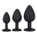 This set of three black silicone butt plugs is a great way to train you or your partner into the world of anal pleasure sensations. Start off slow with the small plug, work your way up to the medium plug, and then experience a real intense stretch with the large plug. Each one of these plugs feature a tapered tip for easy insertion, and all three come with a bedazzling jewel-style base, making them ideal for showing off whilst using them.