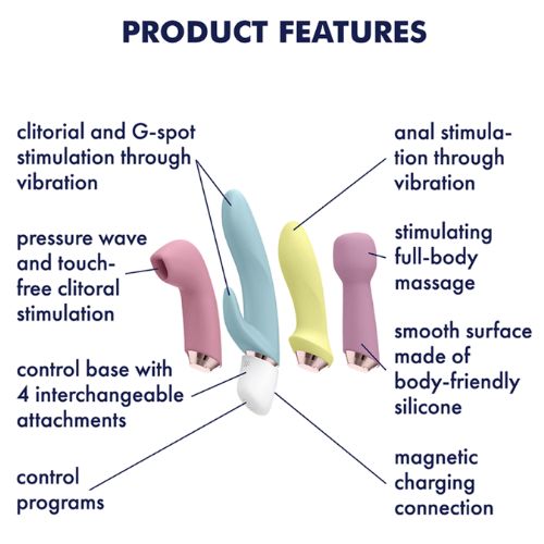 Transform your pleasure experience with the Marvelous Four by Satisfyer - a versatile and luxurious vibrator set that includes a base control element and 4 interchangeable heads (rabbit, G-Spot/anal, massager, and Air Pulse stimulator). With a simple 90° click & rotate motion, switch between attachments for endless possibilities of pleasure.